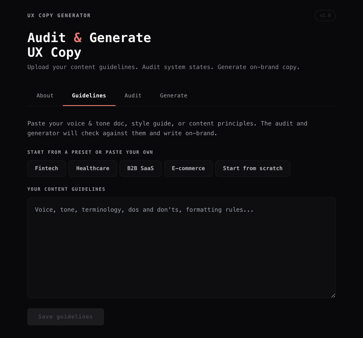 A content systems tool that audits and generates UI copy against any brand's guidelines.